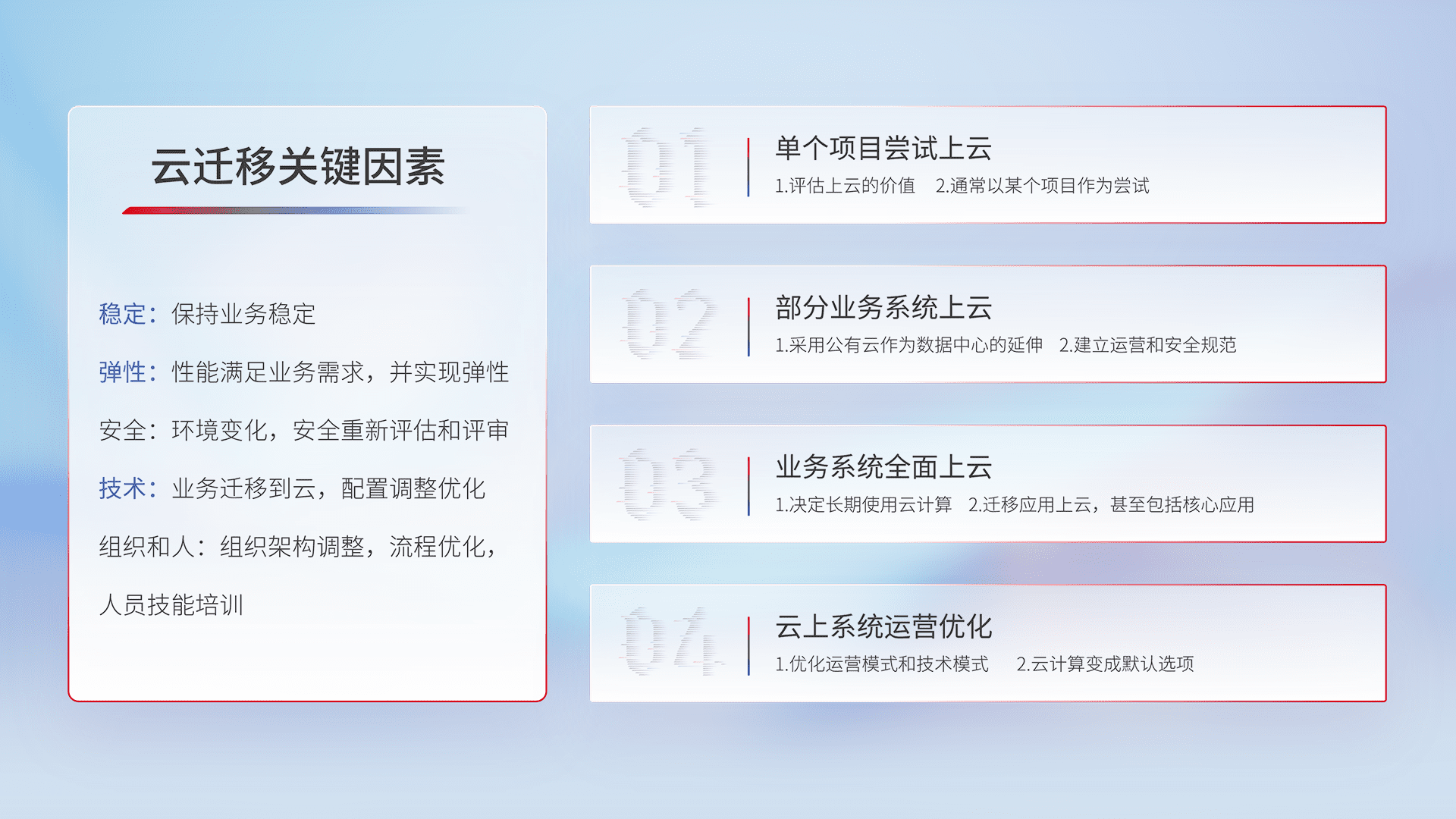 结合实际业务,,从规划设计、、、云平台选型、、、云原生改造、、、数据迁移、、、、集成交付,,,迁移全过程为客户识别最佳上云路径,,,,做好风险识别管理,,设计网络架构、、、、身份权限、、、、安全审计合规、、、、操作审计、、日志审计、、、、监控告警策略、、、多站点容灾设计等,,对云上基础设施进行整体规划,,,,提升IT治理水平,,以满足弹性、、、、高可用、、、、高性能的需求。。