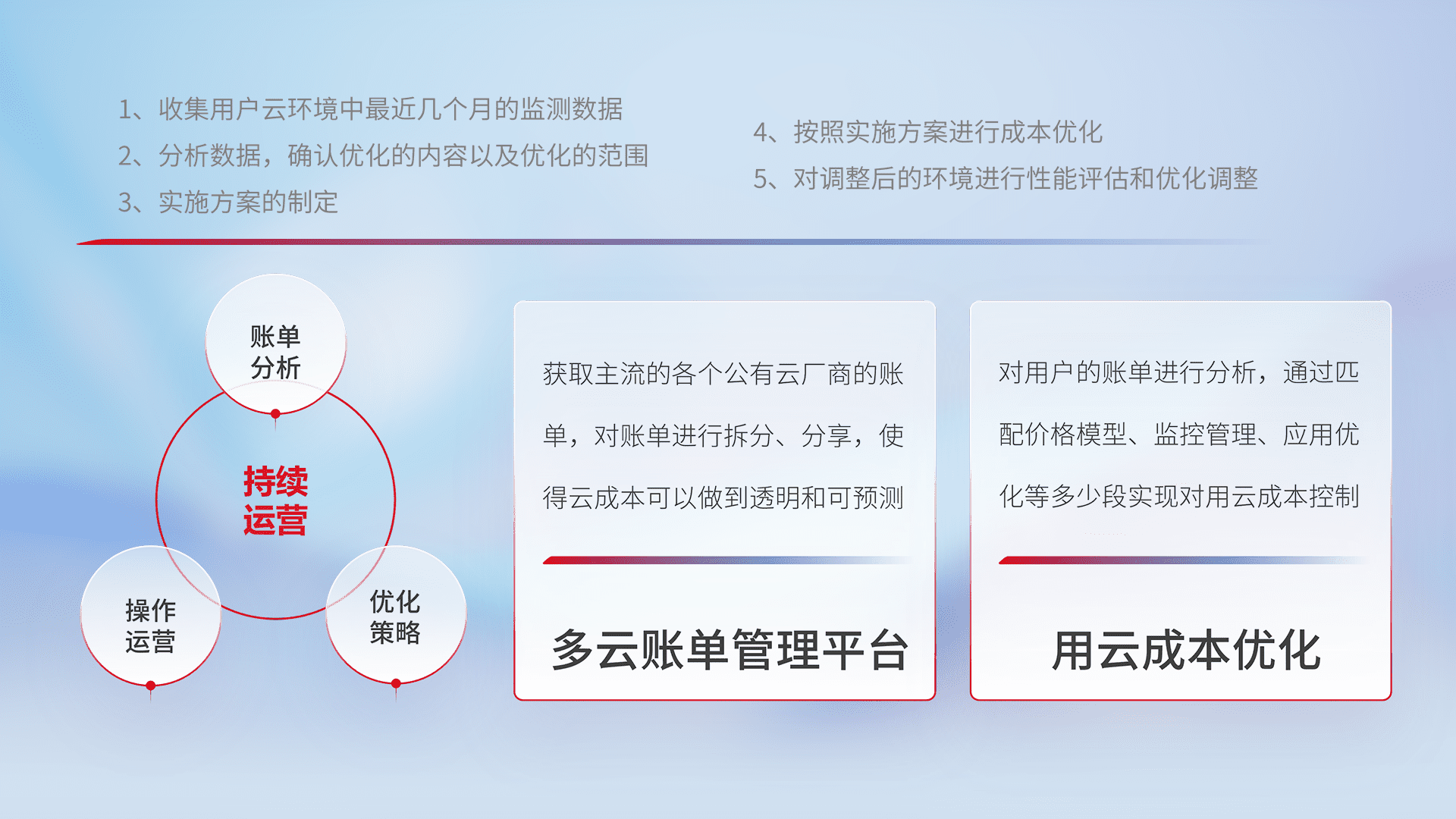 通过多云纳管,,,以统一的资源数据模型把客户的云资源进行抽象和封装,,,,进而实现对多云资源的统一操作,,,,保障云资源管理的可靠性、、稳定性与可用性。。。。量身定制化运维内容,,配置、、、、开发运维、、、补丁管理、、、备份、、、、监控、、认证和访问管理、、审计和日常巡检等,,,,保障在用云过程中的可靠度,,,稳定度以及高可用率。。。。